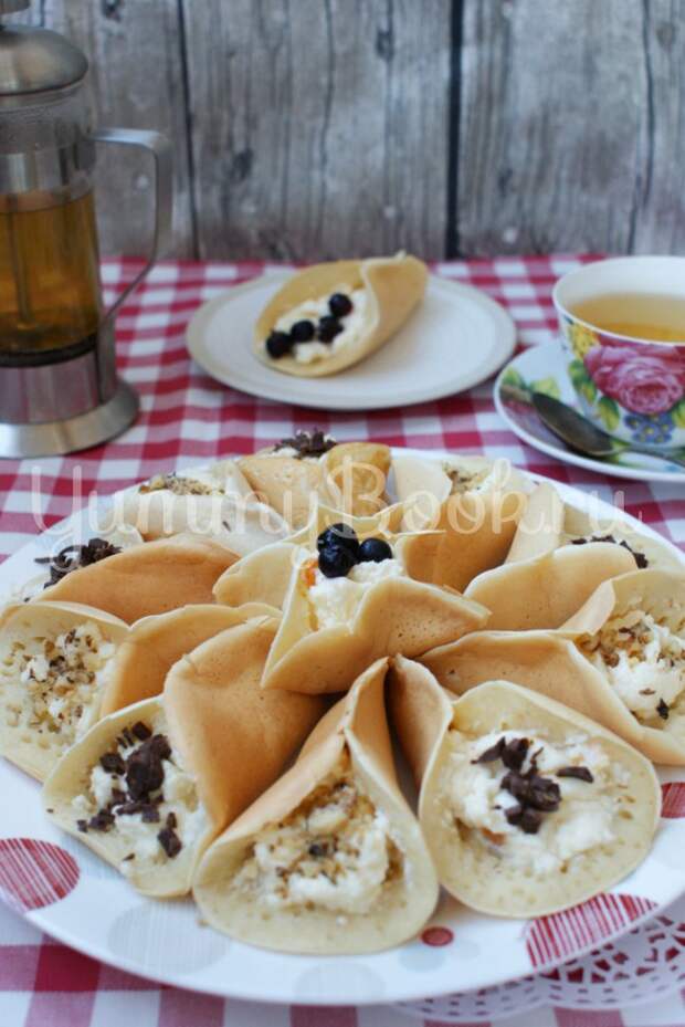 ![]() | 7 Наполнить "кулёчки" начинкой, посыпав шоколадом, орехами, ягодами и подаём на стол к ароматному чаю. Приятного чаепития! |