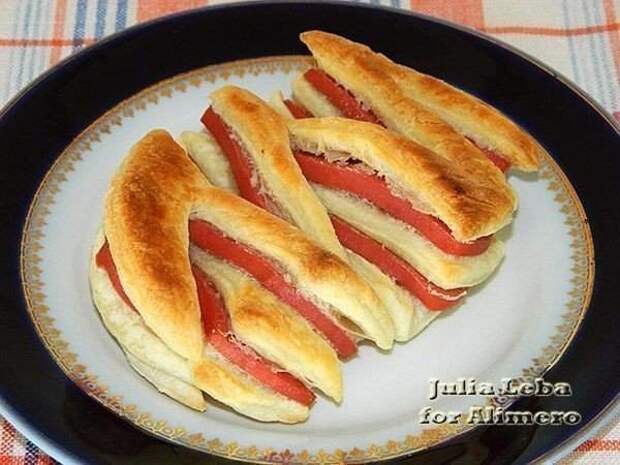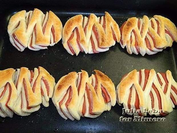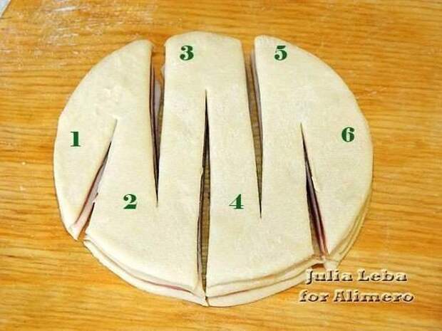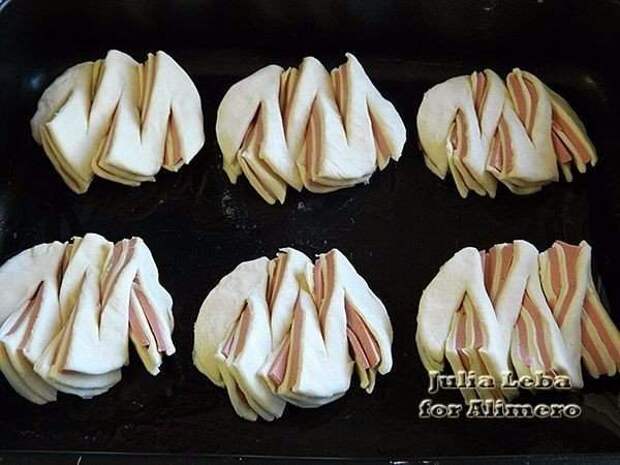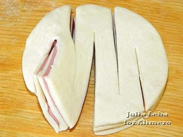 И накрыла последним пластом теста. Теперь самый интересный этап приготовления — формирование слоек. Я сделала 5 разрезов. Первый по середине кружка, не дорезая линию диаметра до края. Второй и третий такие же, только с противоположной стороны, по правую и левую сторону от центрального. И ещё два по краям, но уже с большим наклоном. Дальше действовала слева направо. Крайний кусочек оставила как есть, а второй уже вывернула срезом наружу. Теперь вывернула третий — тот, что сверху.Теперь снизу четвёртый. Сверху пятый...А теперь и последний, шестой. Сформировав все слойки, выложила их на смазанный противень. Выпечка с колбасой. Отправила в разогретую до 200'C духовку минут на 15-20.
