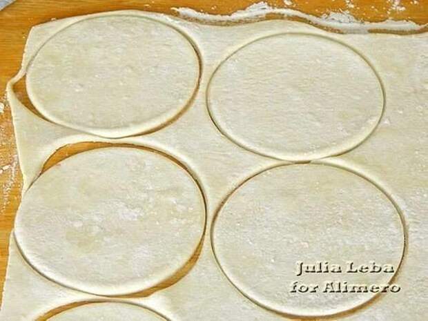 Для шести слоек мне понадобилось 18 кружочков из теста.Разновидностей Докторской колбасы сейчас много. Например, некоторые виды продаются довольно компактными батончиками — небольшими как в длину, так и в ширину. Я же взяла, можно сказать, классический вариант. Диаметр моей колбасы около 8,5 см. Поэтому для вырезания кружков теста подобрала соответствующий размер баночной крышки за неимением формочки.На кружок теста уложила колбасу. На неё снова тесто, затем опять колбасу.